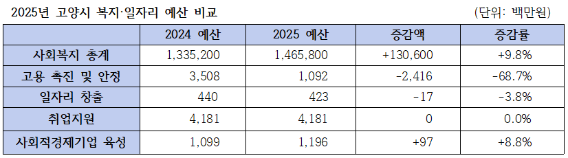 반면, '사회적경제기업 발굴 및 육성'과 '사회적기업 육성'은 각각 8.82%, 8.56% 증가했다. 결국 2025년의 확장재정은 복지와 사회적경제 중심으로 이동, '청년·취업' 중심의 직접 고용창출은 사실상 정체 상태다.