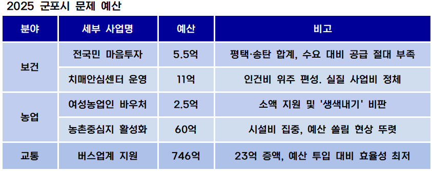 14일 본지가 군포시의회 회의록과 부서별 세부 사업명세서를 분석한 결과 시는 '도시 개발'과 '토목'이라는 거대 담론에 매몰돼 정작 시민의 생명과 직결된 '보건'과 '농업' 분야의 민생 예산이 뒷전으로 밀려난 것으로 나타났다. 긴축 재정 기조 속에서도 축제 예산은 늘리고 필수 민생 예산은 쥐어짜는 시 예산의 불균형이 적나라하게 드러난 셈이다.