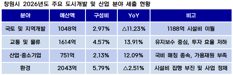 [예결신문=김대성 기자] 창원특례시 2026년 세출 예산안의 도시개발 및 SOC 분야는 대규모 시설비의 집행 부진과 이월액 누적이라는 구조적 문제를 드러냈다. 일반회계 기준 국토 및 지역개발 분야 예산은 1047억원으로 전년 대비 11.23% 감소했으나, 정작 기존에 확보한 예산조차 제때 쓰지 못하는 현상이 반복되고 있다. 도시의 성장을 가로막는 행정적 지연이 심화된 모습이다.