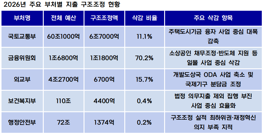 이번에 공개된 구조조정 내역에는 순수한 정책적 우선순위 조정뿐만 아니라 사업 종료, 집행 부진에 따른 감액, 단순 명칭 변경 등이 혼재돼 있다. 지출 구조조정이 단순한 '숫자 맞추기'를 넘어 진정한 재정 개혁으로 이어지려면 사업의 질적 분석이 병행되어야 한다는 주장이 힘을 얻고 있다.