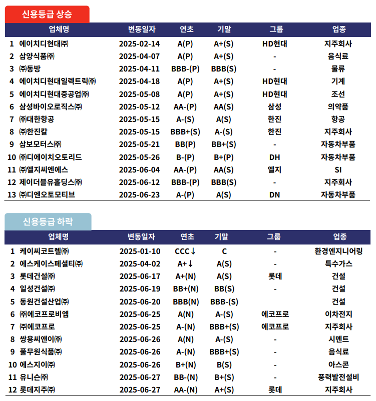 기업의 신용위험 역시 중요한 리스크로 부각되고 있다. 상반기 신용등급 변동 현황에 따르면, HD현대중공업, 삼성중공업(조선업), 현대로템(방산업) 등 13개 기업의 신용등급이 상향됐다. 조선⸱방산업의 수주 잔고 확대와 수출 증가가 주효했다.