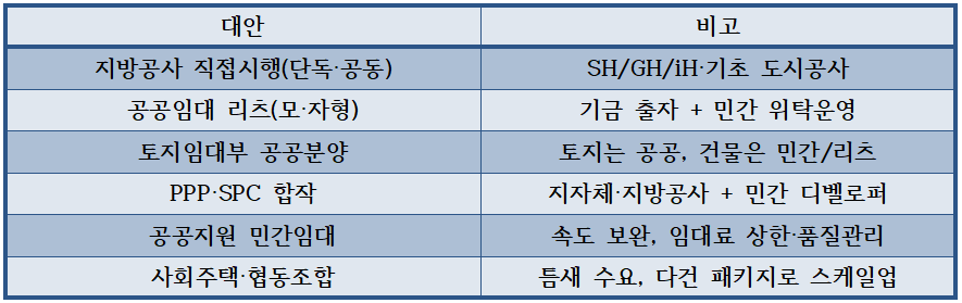 • 권역 다핵 포트폴리오(지방공사·리츠·SPC·토지임대부)로 분산·속도·품질 동시에 잡아야