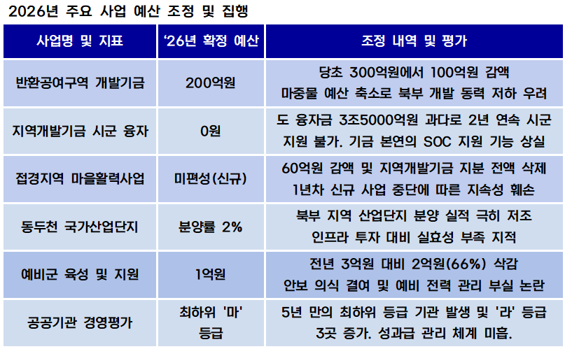 또한 연천군 등에서 추진되던 '군장병 우대업소 지원' 사업은 재정평가 미흡을 이유로 예산이 절반 가까이 깎여 나갔다. 특히 복지 분야에서는 준비 기간 없는 일몰 사업 처리로 인해 현장 종사자들의 고용 불안이 극에 달한 것으로 나타났다.