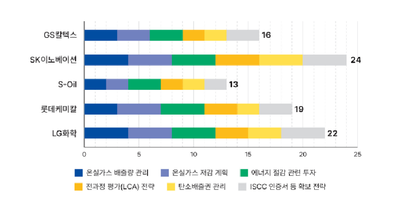 1위에 오른 SK이노베이션조차 'Scope 3(공급망 및 제품 소비 과정에서 발생하는 간접 배출)' 관리와 배출권 확보 전략에서는 점수를 땄으나 정작 온실가스를 줄이기 위한 구체적인 실행 전략과 투자는 미흡한 것으로 나타났다. 최하위인 에쓰오일은 감축 계획 자체가 제한적이고, 필수적인 전 과정 평가 전략조차 부재한 것으로 조사됐다.