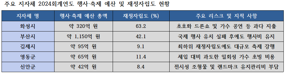 27일 본지가 행안부 '지방재정 365'와 각 지자체의 2024회계연도 결산서를 분석한 결과, 재정자립도가 극히 낮은 지역일수록 오히려 '관광객 유치'라는 명분을 내세워 소모성 행사에 막대한 예산을 쏟아붓고 있는 것으로 나타났다.