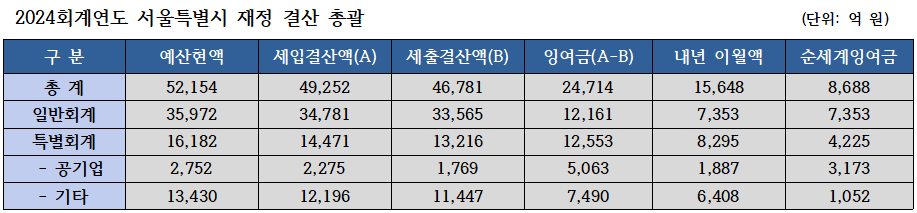 외형적으로는 글로벌 메가시티에 걸맞은 웅장한 재정 규모를 과시했지만, 그 내막엔 '방만'과 '부실'이 공존했다. 막대한 세금을 걷어들이고도 정작 시민을 위해 제때 쓰지 못하고 금고에 남겨둔 '결산상 잉여금(잔액)'이 2조4714억원에 달하는 비효율이 발생한 반면, 오세훈 시장의 역점 사업인 '기후동행카드' 등에서는 천문학적인 적자가 발생해 재정 건전성을 위협하고 있다.