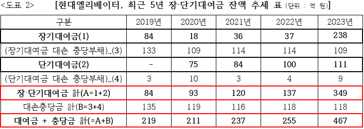 금융감독원 공시자료에 따르면 현대엘리베이터의 장단기 대여금 규모는 지난 2019년 84억원에서 지난해 349억원으로 이 기간 4.2배 폭증했다(도표2).