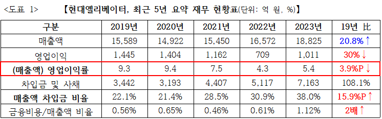 경영 현황은 2019년 기준 매출액 약 1.6조원에서 지난해 1.9조원으로 20.8% 성장했으나 같은 기간 영업이익은 30% 급감했고 영업이익률도 9.3%→ 5.4%로 3.9%포인트 급락했다. 여기에 차입금·금융비용은 나란히 2배 이상 급증했다.