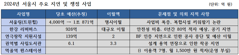 시의회는 2024년 서울시의 이월 사업 리스트는 '보여주기식 행정'이 낳은 참사라고 입을 모았다. 타당성 검토가 부족한 상태에서 시장 공약이라는 이유로 예산부터 편성하고 보자는 식의 '밀어붙이기'가 결국 7300억원의 재정 마비를 불러왔다는 것이다.