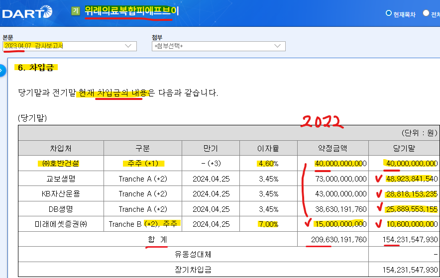 하지만, 사업 인허가 지연 등에 기인, 자금 조달이 어려워 SH공사로부터 토지 매매 계약금과 사업협약이행보증금도 몰취를 당해 회계상 대손(상각= 손상) 처리했다면서도 ▲호반건설 측에서 위례PFV의 매출액이 전무했음에도, 채권에 대한 그 어떤 회수 대책도 없이 대여금을 지원한 이유? ▲설령 토지계약금(325억)을 몰취당했더라도, 나머지 원금 85억(=4백억-325억) 왜 회수하고 있지 않은지? ▲2022년 기준, 위례PFV 차입금 2096억원 중 다른 4개사(교보생명 외)에 553억원(=2093억-1542억)의 돈은 상환하면서, 특수관계사인 호반건설(400억) 차입금만은 왜 상환 하지 않는지? 등에 대한 해명은 하지 않았다.