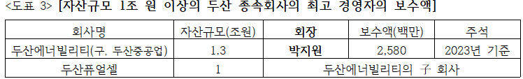 <본지>는 두산 측의 답변을 토대로 ‘연결 대상 종속회사 중, 임원보수액을 확인할 수 있는 사업보고서 작성 대상 업체이면서 자산규모 1조원 이상을 기준으로 추출한 결과 두 회사를 찾을 수 있었다<도표 3>.