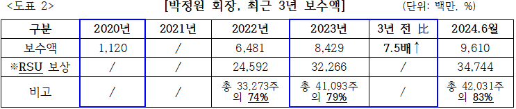 박 회장의 보수액은 2020년 11억원→ 2022년 65억원→ 2023년 84억원→ 지난해 6월 기준 96억원으로 3년 반 새 9배 급증했다.