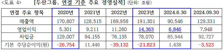 우선, 2023년 주당순이익은 마이너스였으며 지난해 6월 말 기준 반기 매출액은 9조(× 2= 약 18조원, 연간)원으로 전년(19.1조원) 수준이었고 두산측이 내세운 차입금 항목 또한 2023년 7.8조원→ 2024년 6월 8.6조(→ 9월 말 9.3조원)원으로 1년 새 약 8000억원이 증가했는데, 같은 기간 박 회장의 보수액은 65억원→ 96억원으로 1년 6개월 만에 되레 48% 급등했다.