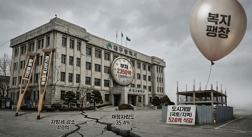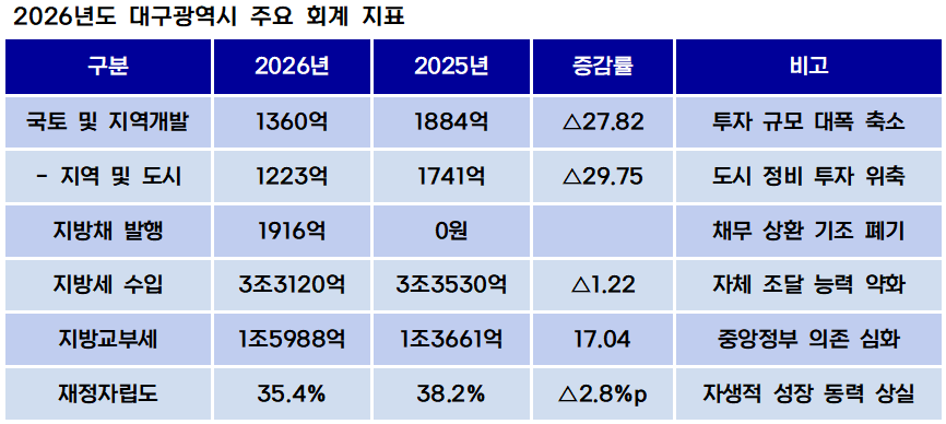 12일 예결신문이 대구시 2026년 예산안을 분석한 결과 시는 세수 결손을 메우기 위해 일반회계에서만 1916억원의 지방채를 신규 발행했다. 이는 전년도 무차입과 대조되는 부채 경영으로의 급격한 선회다. 여기에 자체 재원 조달 능력을 나타내는 재정자립도는 35.4%로 하락하며 대구 재정이 중앙정부의 지원금과 빚에 의존해 토건 사업을 유지하는 구조임을 나타냈다.