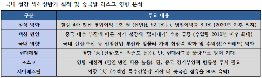 실적 부진의 핵심 원인은 중국산 철강재의 대거 유입이다. 특히 중국 내수 철강 소비의 절반 이상을 차지하는 부동산 시장이 장기 침체에 빠지면서 발생한 막대한 과잉 재고가 인접국인 한국으로 쏟아지는 형국이다.