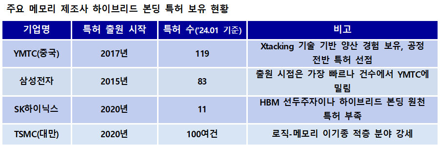 반면, 2015년부터 관련 기술을 출원해 온 삼성전자는 2023년 말 기준 83건에 머물렀으며, 2020년 뒤늦게 출원을 시작한 SK하이닉스는 11건에 불과했다. 현재 이 분야의 핵심 권리는 미국의 엑스페리(Xperi), 중국의 YMTC, 대만의 TSMC 등 3사에 집중된 양상이다.