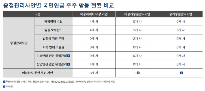 다른 중점관리사안 중 배당정책·임원 보수 등 기업 지배구조와 관련된 항목은 물론, 기후변화와 같은 시기에 도입된 산업안전 항목에서는 4곳의 비공개 대화 대상 기업이 선정된 것을 감안하면 현저히 저조한 실적이다. 기후변화 사안으로는 사전절차 격인 비공개 면담을 13곳의 기업과 진행한 내역만 확인됐다.