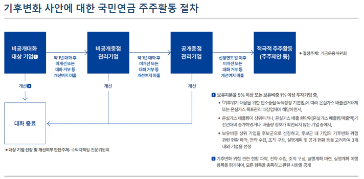 앞서 2023년 3월 국민연금은 ‘국민연금기금 수탁자 책임에 관한 원칙’을 개정, 중점관리사안에 ‘기후변화 관련 위험 관리가 필요한 사안’을 추가한 바 있다. 투자 대상 기업 중 온실가스를 대량 배출하면서도 감축 계획 및 조처가 미흡하거나 이로 인해 기업가치 하락 위험이 있는 곳을 대상으로 전략 개선을 요구하거나 주주제안을 진행하는 등 적극적으로 개입할 수 있게 했다.