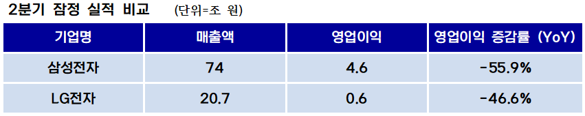 [예결신문=신세린 기자] 삼성전자와 LG전자의 올 2분기 실적이 당초 시장 기대치를 크게 밑돌며 어닝 쇼크를 기록했다. 반도체 산업 부진, 미국발 관세 충격, 글로벌 수요 위축 등 복합 악재가 한국 대표 기업들의 수익성을 흔드는 모습이다.