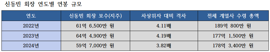 실제로 2024년 지급된 등기임원 보수 총액 93억원 중 약 64%인 59억7000만원이 신 회장 몫이었다. 이는 차상위 보수 수령자인 이동우 대표(15억6000만원)와 비교했을 때 3.82배에 달하는 수치다. 지난 수년간의 추이를 봐도 격차는 심각한 수준이다.