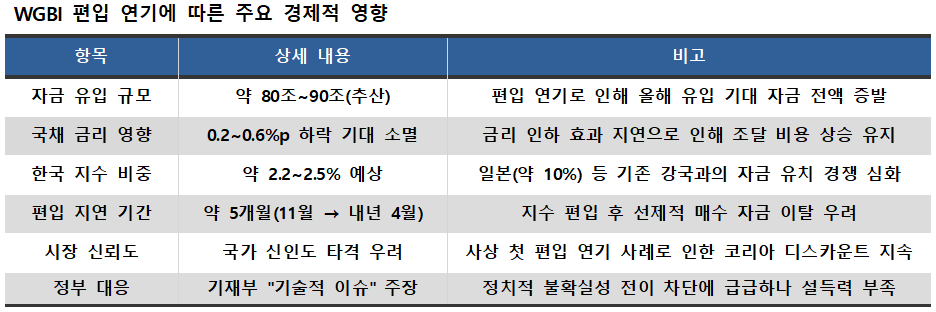 WGBI는 '선진국 국채 클럽'으로 불릴 만큼 공신력이 높으며 지수 편입 시 외국 자본 유출에 대한 불안감을 해소하고 안정적인 장기 투자 자금을 유입시키는 효과가 있다. 전문가들은 한국이 계획대로 편입됐다면 약 90조원 규모의 해외 자금이 국내에 유입, 국채 금리를 0.2%p에서 최대 0.6%p 낮췄을 것으로 보고 있다. 현재 10년 만기 국채 금리가 2.60% 수준인 점을 감안하면, 이번 연기로 인해 가계와 기업의 금융 부담을 완화할 기회를 놓친 셈이다.