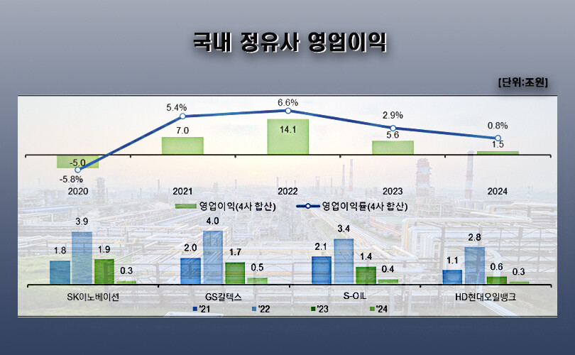 국내 정유 4사(SK이노·GS칼텍스·에쓰오일·HD현대오일뱅크)가 2024년 연결 기준 합산 영업이익 1조5000억원을 기록하며 전년 대비 73.2% 하락한 부진한 성적표를 받았다. 정유 및 석유화학부문의 실적 부진으로 업체별로 전년 대비 1조원가량의 영업이익이 감소했다.