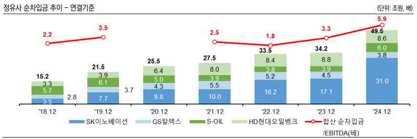 SK이노베이션과 에쓰오일이 대규모 비정유부문 투자를 진행하는 가운데 정유 부문을 중심으로 영업실적이 저하됨에 따라 작년 4사 합산 순차입금/EBITDA는 전년 3.3배에서 작년 5.9배로 상승했다.