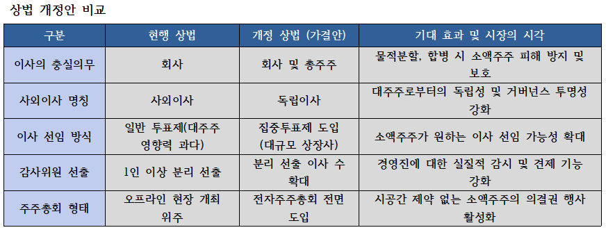시장 전문가들은 이번 법안 통과가 한국 증시의 체질을 근본적으로 개선할 것으로 보고 있다. 이남우 한국기업거버넌스포럼 회장은 "그동안 한국의 이사회는 지배주주의 의사를 집행하는 기구에 불과했다"며 "주주 충실의무 도입은 이사회가 실질적인 독립성을 갖추고 모든 주주의 비례적 이익을 고려하게 만드는 강력한 법적 유인책이 될 것”이라고 평가했다.