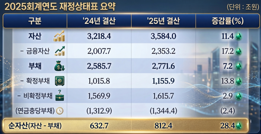 결국 2025년 국가결산은 세수 회복이라는 긍정적 신호에도 불구하고, 국가채무와 연금충당부채라는 두 갈래의 거대한 빚더미가 재정의 지속 가능성을 압박하고 있음을 시사한다. 향후 긴축적 재정 기조 유지와 더불어 구조적인 연금 개혁이 뒷받침되지 않는다면 재정 건전성 확보는 요원할 것으로 보인다.
