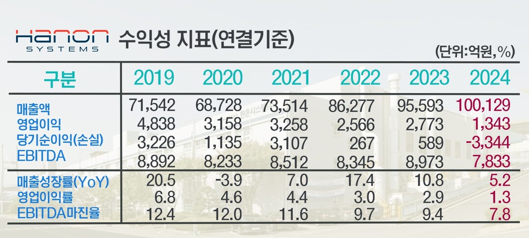 20일 금융감독원 공시자료에 따르면 한온시스템의 잠정기준 지난해 매출액은 10조129억원, 영업이익 1343억원, 당기순이익 –3344억원을 기록했다. 매출액은 전년 9조5593억원에서 다소 늘었으나 영업이익은 전년 2773억원 대비 52.6%나 하락했다. 영업이익률은 1.3%에 불과했다.