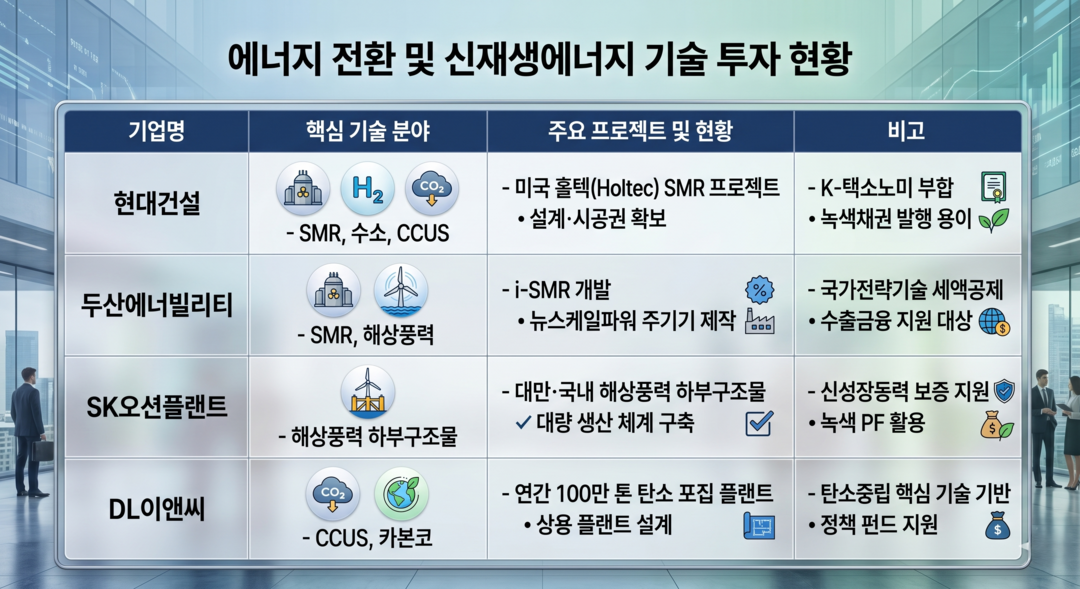 현대건설은 한국형 소형모듈원전(i-SMR) 개발과 미국 홀텍사와의 협력을 통해 독자적인 시공권을 확보하고 있으며, DL이앤씨는 탄소 포집 및 저장(CCUS) 기술을 고도화해 연간 100만 톤 이상의 포집 능력을 갖춘 플랜트 설계를 주도하고 있다.