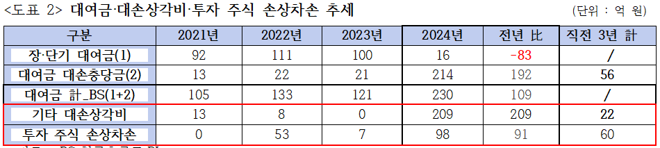 특히, 대여금 <대손상각비>로 떨어낸 비용이 직전년 2023년 0원→ 작년 209억원으로 폭등했고 같은 기간 <투자 주식 손상차손>도 7억원→ 98억원으로 1년 만에 91억원이 급증, 2개 항목에서 직전년 대비 300억원 이상 급증한 것이 주요인으로 분석됐다(도표 2).