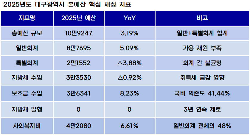 [예결신문=김대성•김민준 기자] 대구광역시의 2025년도 본예산 총 규모는 10조9246억원으로 전년 본예산(10조5872억원) 대비 3.19% 증가했다. 회계별로 살펴보면 일반회계가 8조7694억원으로 전년 대비 5.09% 늘어난 반면, 특별회계는 2조1552억원으로 오히려 3.88% 감소하며 세입 구조의 불균형을 드러냈다.