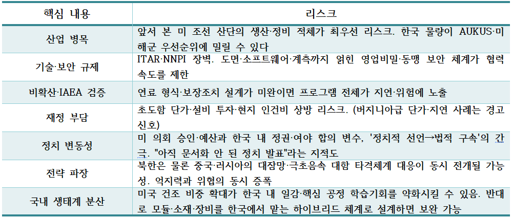 핵추진 잠수함의 핵심 기술은 NNPI(해군 원자력 추진 정보)로, 미국이 가장 민감하게 다루는 영역이다. AUKUS에서도 미국·영국은 '가장 높은 비확산 기준'을 천명했지만, 타국 보편 모델이 아님을 명시한다. 즉, 한국에 동일 수준의 이전·공유가 보장된다는 뜻은 아니라는 것이다.