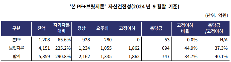 PF 관련 자산의 양적 부담이 상당해 당분간 건전성 관리 부담도 지속될 전망이다. 올 9월 말 바로저축은행의 PF 관련 대출잔액은 5359억원으로 자기자본 대비 291%에 달하는 과중한 수준이다. 지난해 말(7153억원) 대비 익스포저(최대 손실우려 금액)가 축소된 점은 긍정적이나, 사업장 부실화와 사업성 평가기준 강화로 부실여신이 급증했으며 부실 완충력도 크게 낮아졌다.