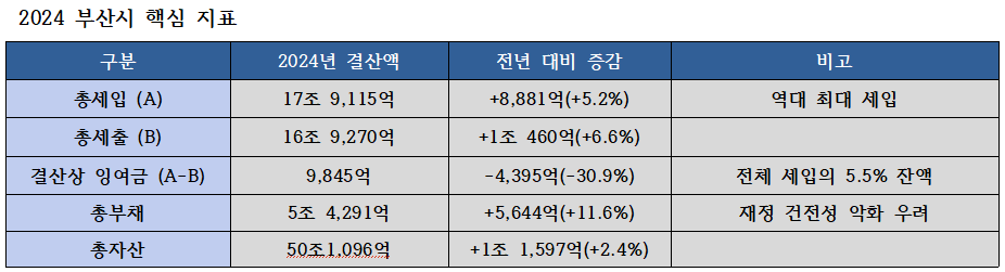 [예결신문=김지수⸱백도현 기자] 부산시의 2024회계연도 결산 결과 총세입 17조9115억원을 기록하며 사상 최대 규모를 기록했다. 전년도(17조234억원) 대비 8881억원(5.2%) 증가한 수치로, 외형적으로는 시 재정이 성장세를 지속하고 있음을 보여준다.