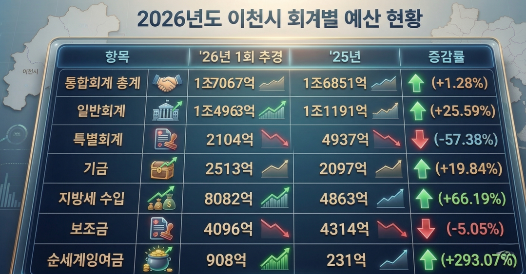 [예결신문=김대성 기자] 이천시의 2026년도 예산 규모는 제1회 추가경정예산을 거치며 통합회계 기준 1조7067억원으로 대폭 확대됐다. 이는 당초 예산인 1조3506억원 대비 3560억원(26.37%)이 순증한 수치로, SK하이닉스의 경영 실적 개선에 따른 지방세 수입 폭증이 재정 규모를 견인한 결과다.