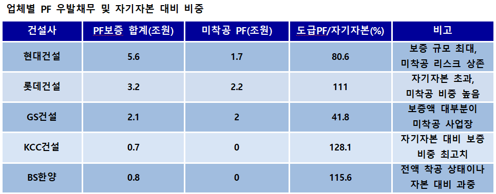 현대건설은 5.6조 원으로 가장 큰 보증 규모를 보유하고 있으며, 롯데건설(3.2조 원)과 GS건설(2.1조 원)은 전체 보증액 중 미착공 PF가 차지하는 비중이 압도적으로 높다. 특히 KCC건설(128.1%), BS한양(115.6%), 롯데건설(111.0%)은 도급 PF 규모가 자기자본을 상회하고 있어 사업성 악화 시 자본 잠식 가능성까지 거론된다.