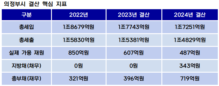 4일 예결신문이 의정부시 '2024회계연도 결산 승인안'과 시의회 예산결산특별위원회 심사 자료를 분석한 결과, 시 재정은 일시적 침체가 아닌 구조적인 하락 국면에 진입했다.