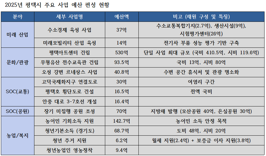 • 평택아트센터 건립과 수소·반도체 등 미래 산업 선점을 핵심 과제로 삼아 재정 역량 집중
