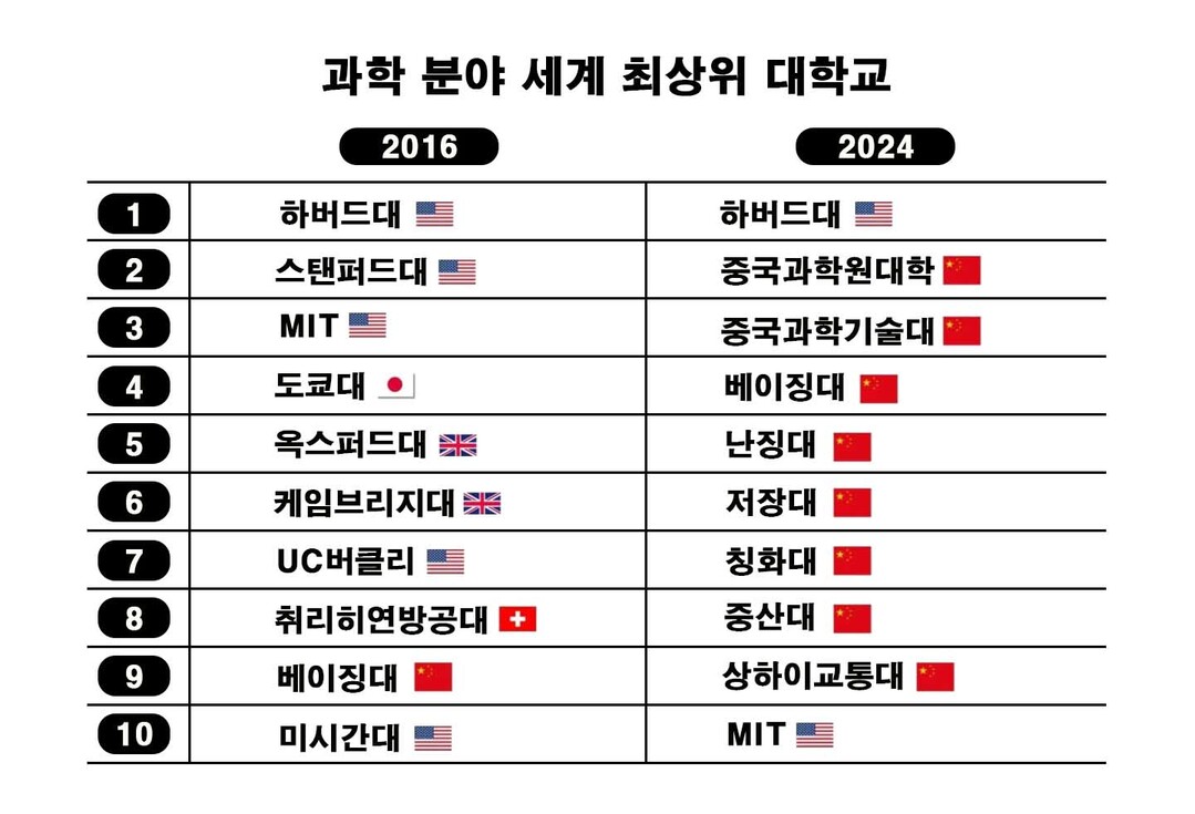 반면, 2016년 상위 10위 중 5개를 차지했던 미국 대학들은 작년 하버드대(1위)와 MIT(10위)를 제외하곤 자취를 감췄다. 또 2016년 4위를 차지했던 도쿄대(일본), 5위 옥스퍼드대(영국), 6위 캐임브리지대(영국) 7위 UC버클리대(미국), 8위 취리히연방공대(그위스), 10위 미시간대(미국) 등은 모두 10위권 밖으로 밀려났다.