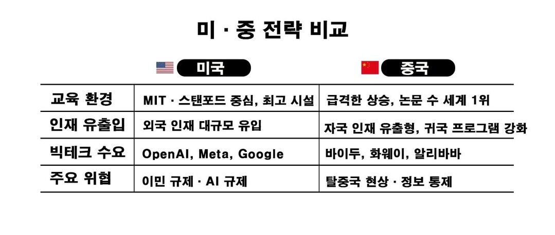 현재 미국은 MIT·스탠퍼드 같은 최고 교육 환경과 자본을 무기로 타국 인재를 흡수하고 있으며 중국은 논문 수 세계 1위, AI 스타트업 폭발적 성장, 정부 지원을 바탕으로 한 내부 인재 육성 등으로 미국에 맞서고 있다.