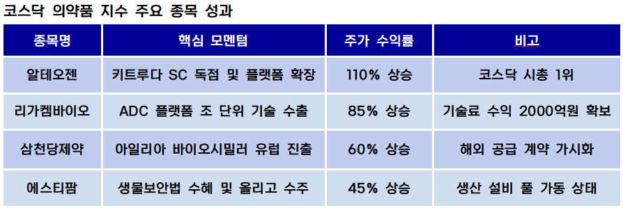 실제로 알테오젠을 필두로 한 플랫폼 기업들의 활약은 지수 전체의 상승 동력을 제공했다. 증권가에서는 알테오젠의 성공 사례가 다른 바이오 플랫폼 기업들에 대한 신뢰도로 이어졌다고 분석한다.