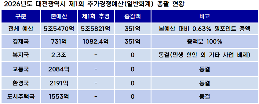 더욱 눈에 띄는 것은 예산의 배분 구조다. 이번 추경은 이른바 '독식'이다. 본지가 조직별 세출 총괄표를 분석한 결과, 대전시청 내 수십 개의 실·국·본부 중 예산이 단 1원이라도 늘어난 곳은 '경제국'이 유일했다.