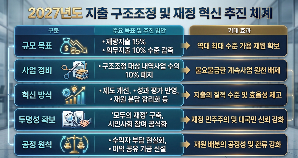 [예결신문=김민준 기자] 정부가 발표한 2027년 예산안 편성 지침의 핵심은 가용 재원을 확보해 국정 성과를 극대화하기 위한 '성역 없는' 지출 구조조정이다. 정부는 재정의 지속가능성을 확보하고 적극적 재정 운용을 뒷받침하기 위해 역대 최대 수준의 지출 재구조화를 단행한다는 방침을 세웠다.
