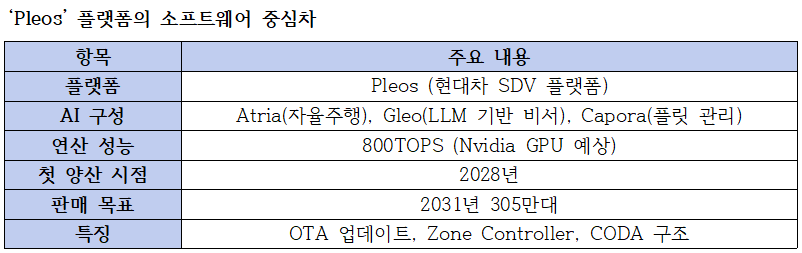 현대차는 'Pleoss(플레오스 ⸱ 차세대 모빌리티 소프트웨어 플랫폼 브랜드, '더 많은'을 뜻하는 라틴어 'Pleo'와 운영체제 'OS'의 합성어)'라는 소프트웨어 중심 자동차(SDV) 플랫폼을 공개하며 AI 자율주행(Atria AI), 음성비서(Gleo AI), 차량군 관리(Capora AI)를 하나로 통합할 계획이다