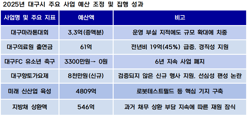 시가 강조한 '강도 높은 세출 재구조화'가 특정 종목이나 분야에만 가혹하게 적용됐다는 형평성 문제도 제기됐다. 지난 6년간 지속적으로 지원해온 대구FC 유소년 축구클럽 운영 지원 예산 3300만원은 타 종목과의 형평성과 입단 실적 저조를 이유로 전액 삭감(0원)됐다.