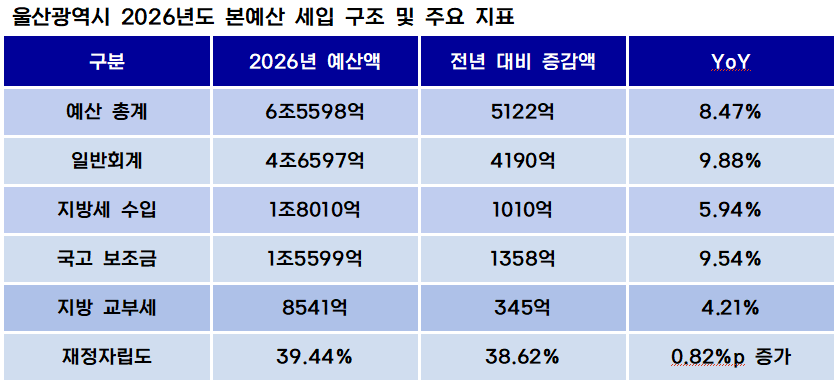 [예결신문=김대성 기자] 울산광역시의 2026년도 통합회계 예산 총 규모는 전년 대비 5122억원(8.47%) 증가한 6조5598억원이다. 일반회계는 4조6597억원으로 전년 대비 9.88% 성장했으나, 재정자립도는 39.44%로 여전히 40%의 벽을 넘지 못하고 있다.