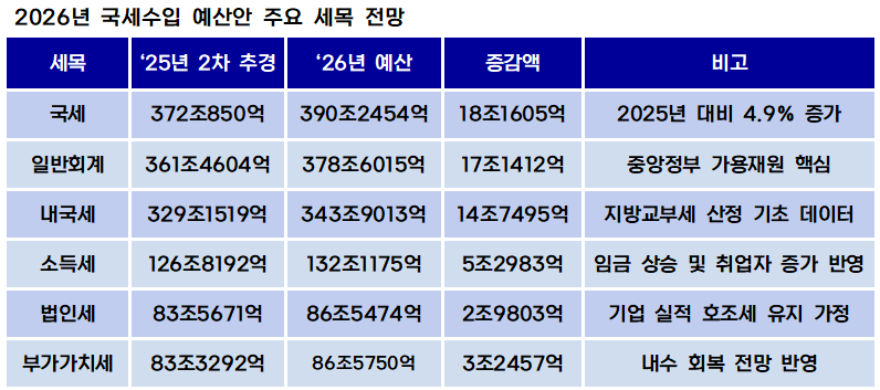 18일 기획재정부의 '2026년 국세수입 예산안'에 따르면 내년도 총국세는 올 2차 추경예산인 372조850억원 대비 18조1605억원 증가한 390조2454억원으로 편성됐다. 세목별로는 소득세가 132조1175억원으로 가장 큰 비중을 차지하며, 법인세(86조5474억원)와 부가가치세(86조5750억원) 등이 뒤를 잇는다. 정부는 경기 회복에 따른 기업 실적 호조와 임금 상승, 취업자 증가 등을 근거로 세수가 2올해 대비 4.9% 증가할 것으로 내다봤다.