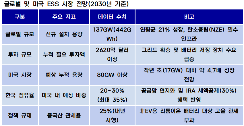 블룸버그는 "2030년 미국 ESS 시장에서 한국 기업들이 현지화와 정책 지원을 바탕으로 확보할 수 있는 점유율은 20~30%, 최대 35%로 확대될 수 있다"는 긍정적 전망을 내놨다. 이는 64~112GWh 공급량에 해당하는 수치로, 전력⸱배터리 산업 전반의 성장 동력으로 작용할 전망이다.